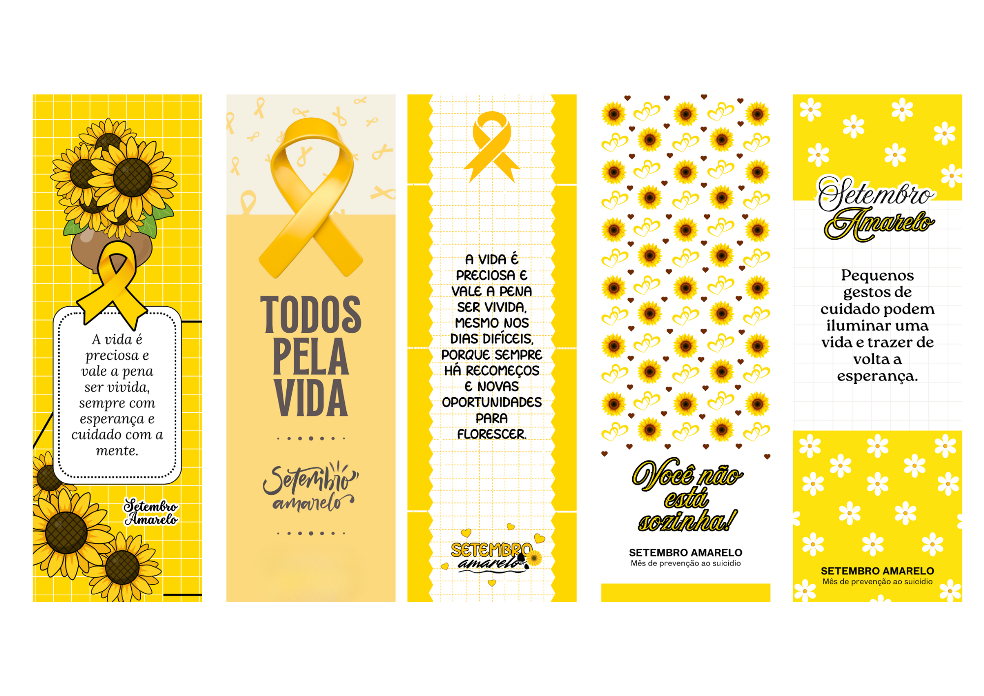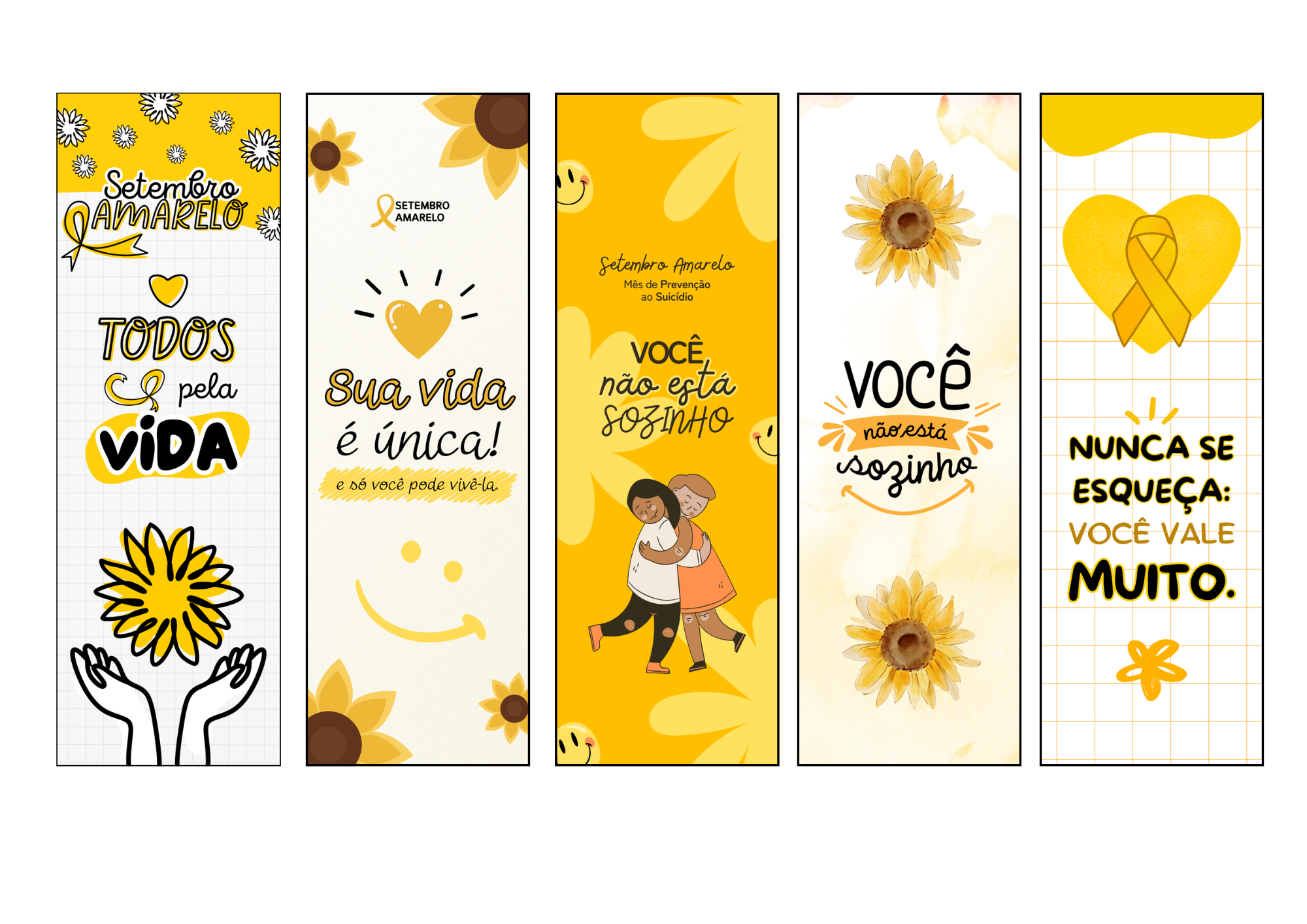 Este kit contém 10 marcadores de página exclusivos, com designs inspiradores e mensagens motivacionais sobre o Setembro Amarelo, campanha de prevenção ao suicídio.