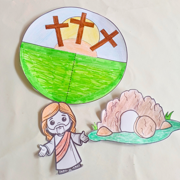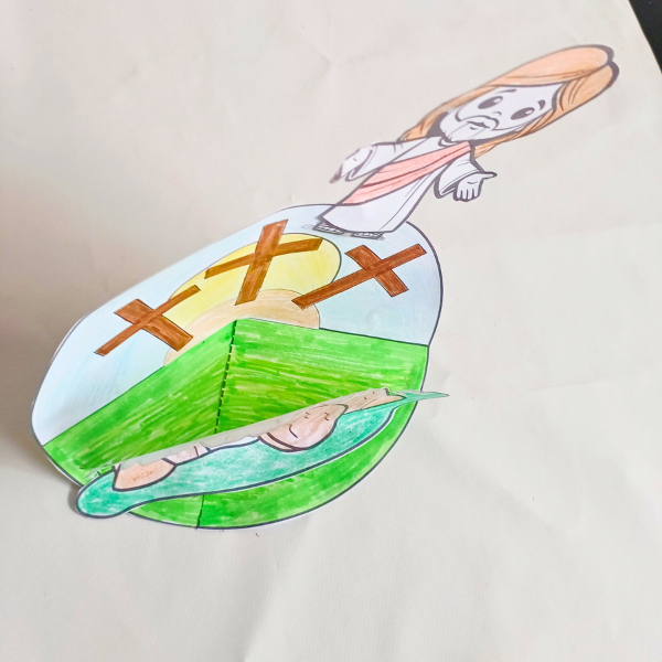 Na parte superior, há a figura de Jesus ressuscitado, com os braços abertos, transmitindo alegria e acolhimento. A imagem pode ser movimentada ou levantada, tornando a proposta interativa e envolvente para as crianças.
