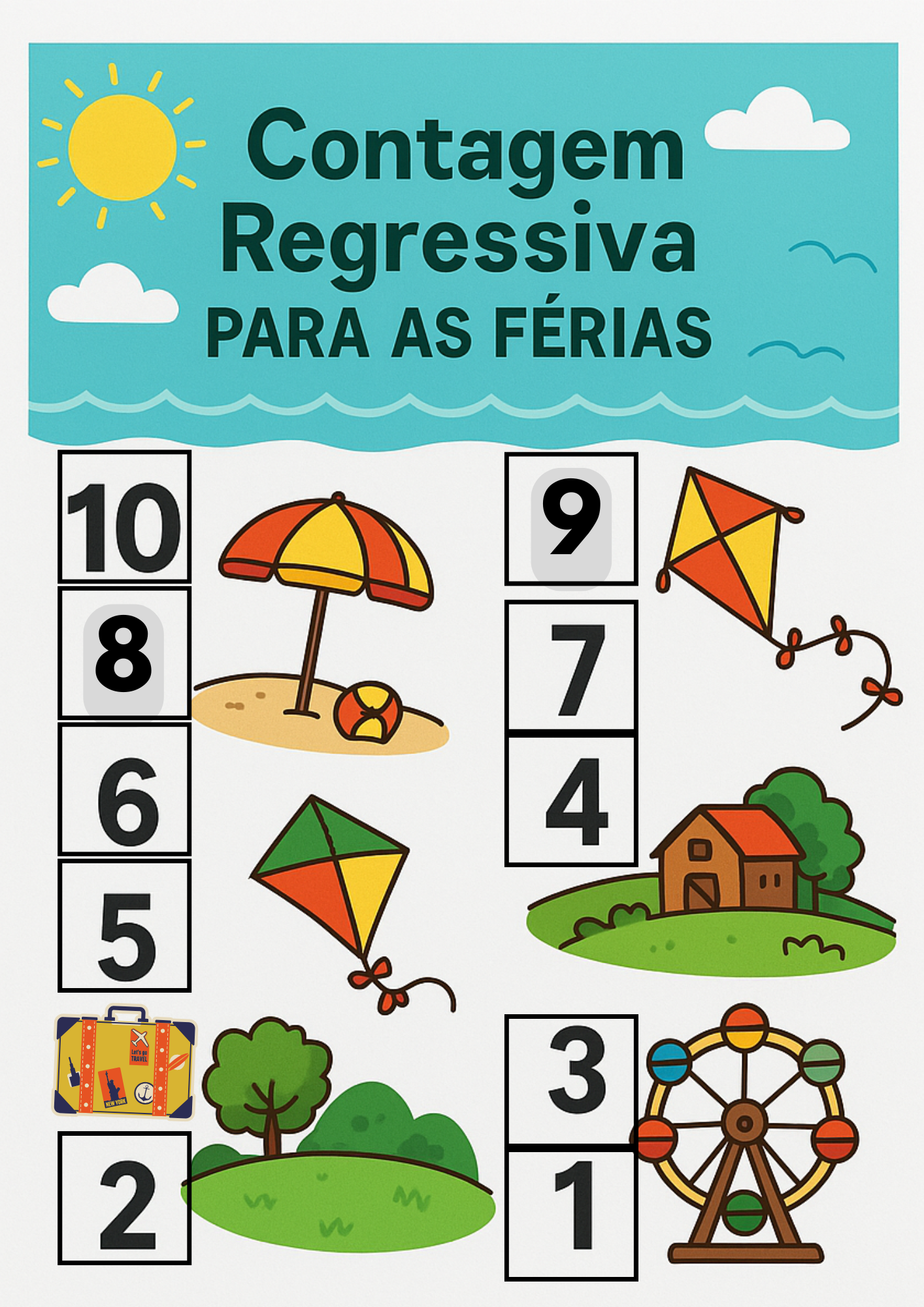 O cartaz é composto por 10 números (de 10 a 1), formando uma contagem regressiva especial até o tão esperado dia das férias!