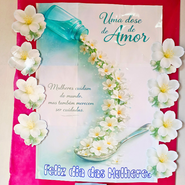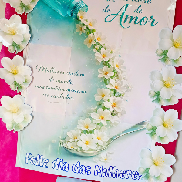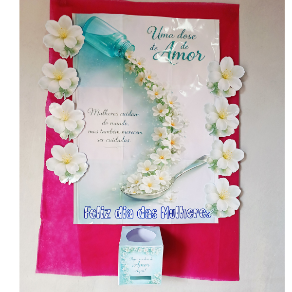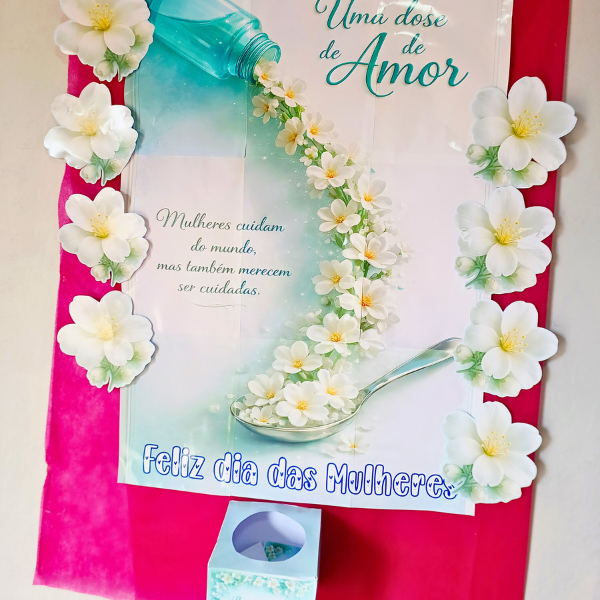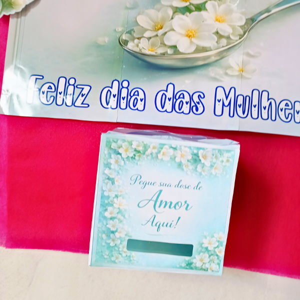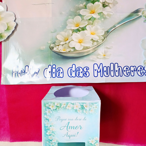 Com um design delicado em tons de azul turquesa, flores brancas e detalhes suaves, a caixa transmite calma, acolhimento e amor, tornando-se perfeita para ações comemorativas, homenagens e momentos especiais no Dia das Mulheres.