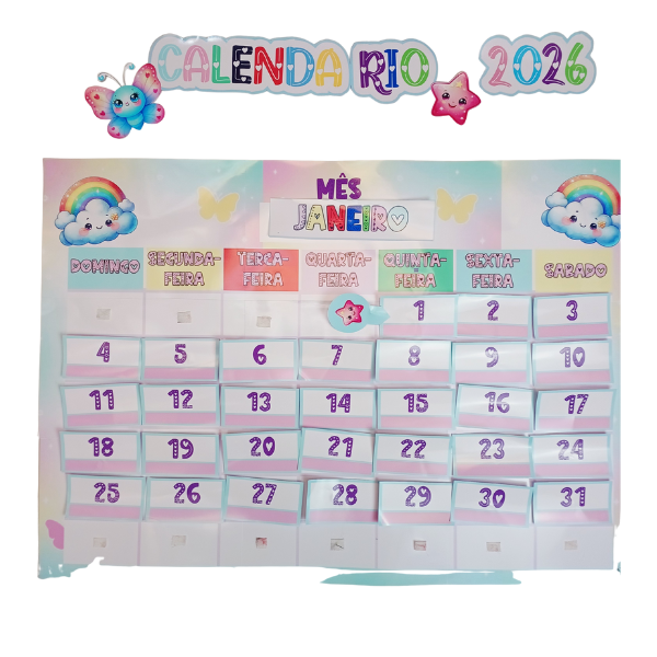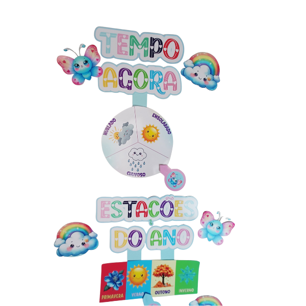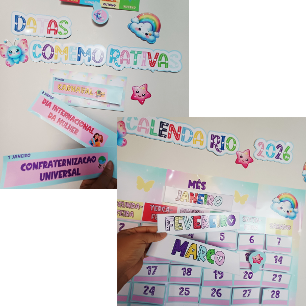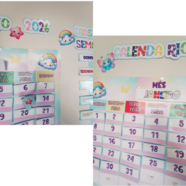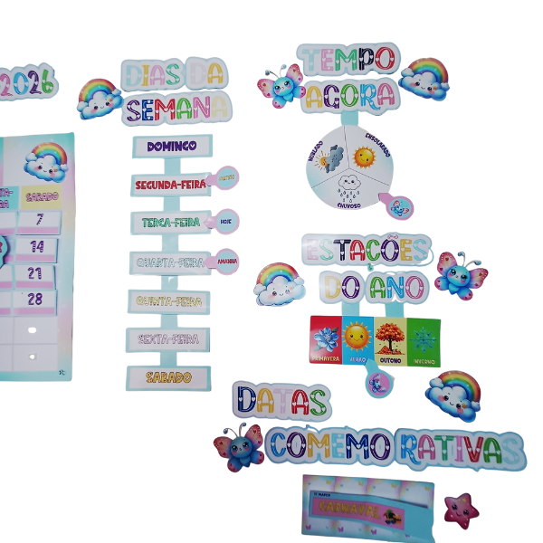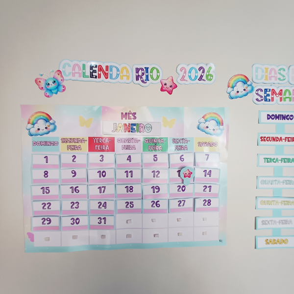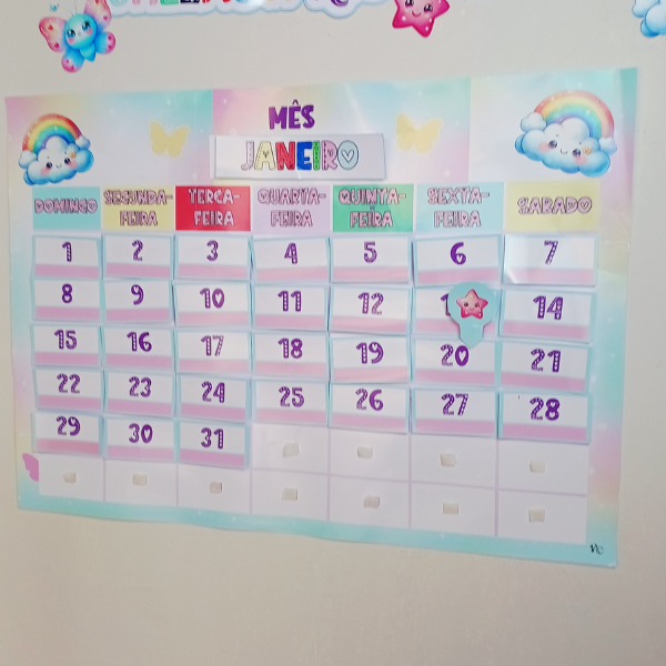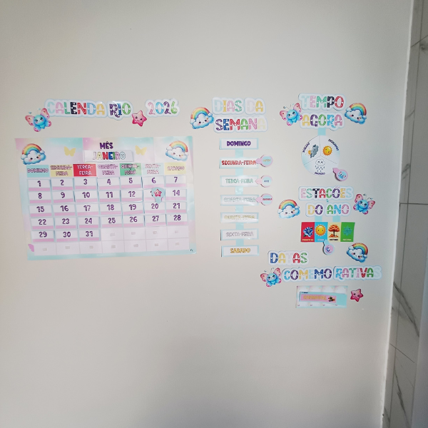 O Calendário Interativo Borboletas do Tempo é um material pedagógico completo, criado com elementos delicados de arco-íris e borboletas, trazendo leveza, organização e magia para o seu cantinho da rotina.