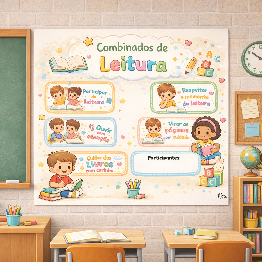 O Kit de Painéis – Combinados de Leitura e Escrita foi criado especialmente para Educação Infantil e anos iniciais do Ensino Fundamental, com ilustrações em estilo desenho animado fofo, cores suaves e linguagem acessível às crianças.