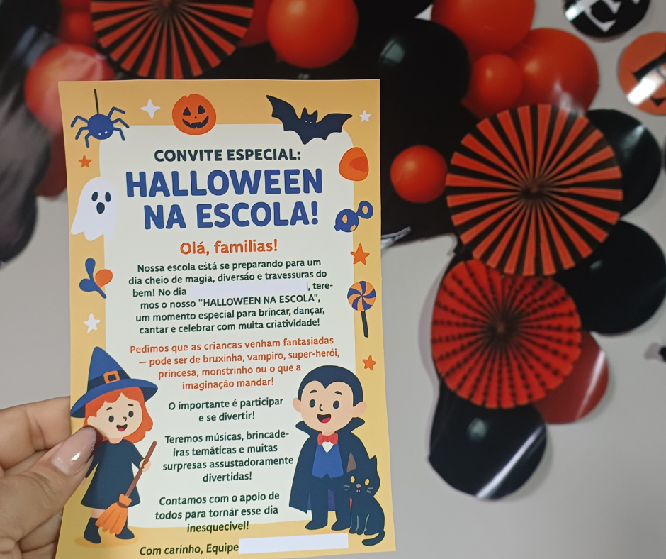 • 🧙‍♀️ Convite ilustrado – modelo alegre e colorido, pronto para enviar aos pais e anunciar o evento com toda a magia que o Halloween merece!