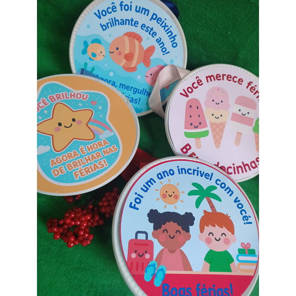 Cada tag traz uma mensagem divertida e positiva para celebrar o aprendizado, a amizade e o descanso merecido das crianças. Ideal para lembrancinhas escolares, mimos de encerramento ou atividades de despedida.