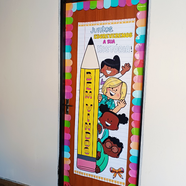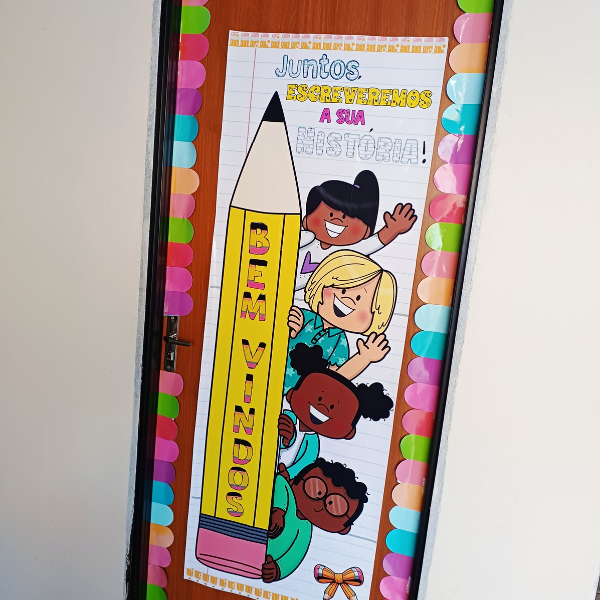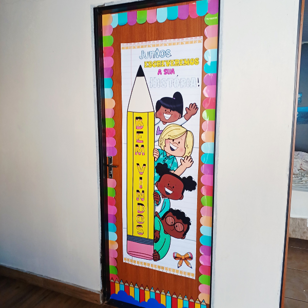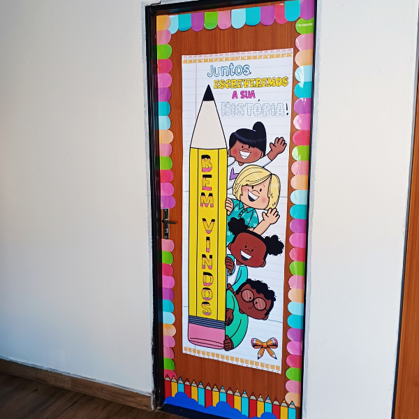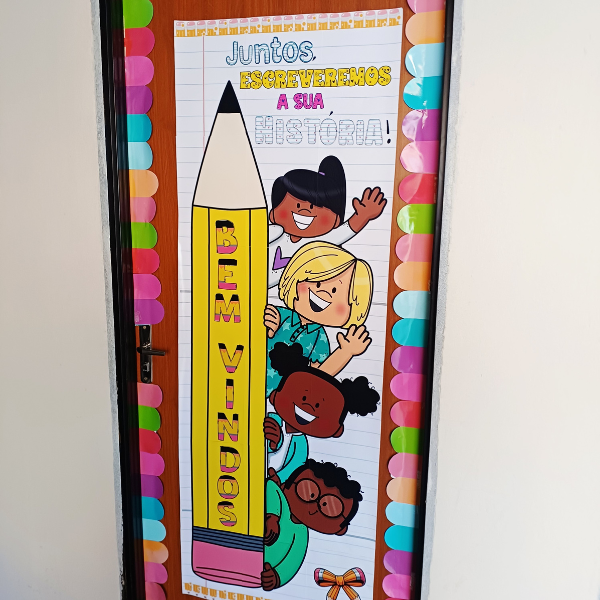 Porque ele transforma a porta da sala em um portal de boas-vindas, transmitindo afeto e mostrando que cada criança faz parte dessa história que está só começando.