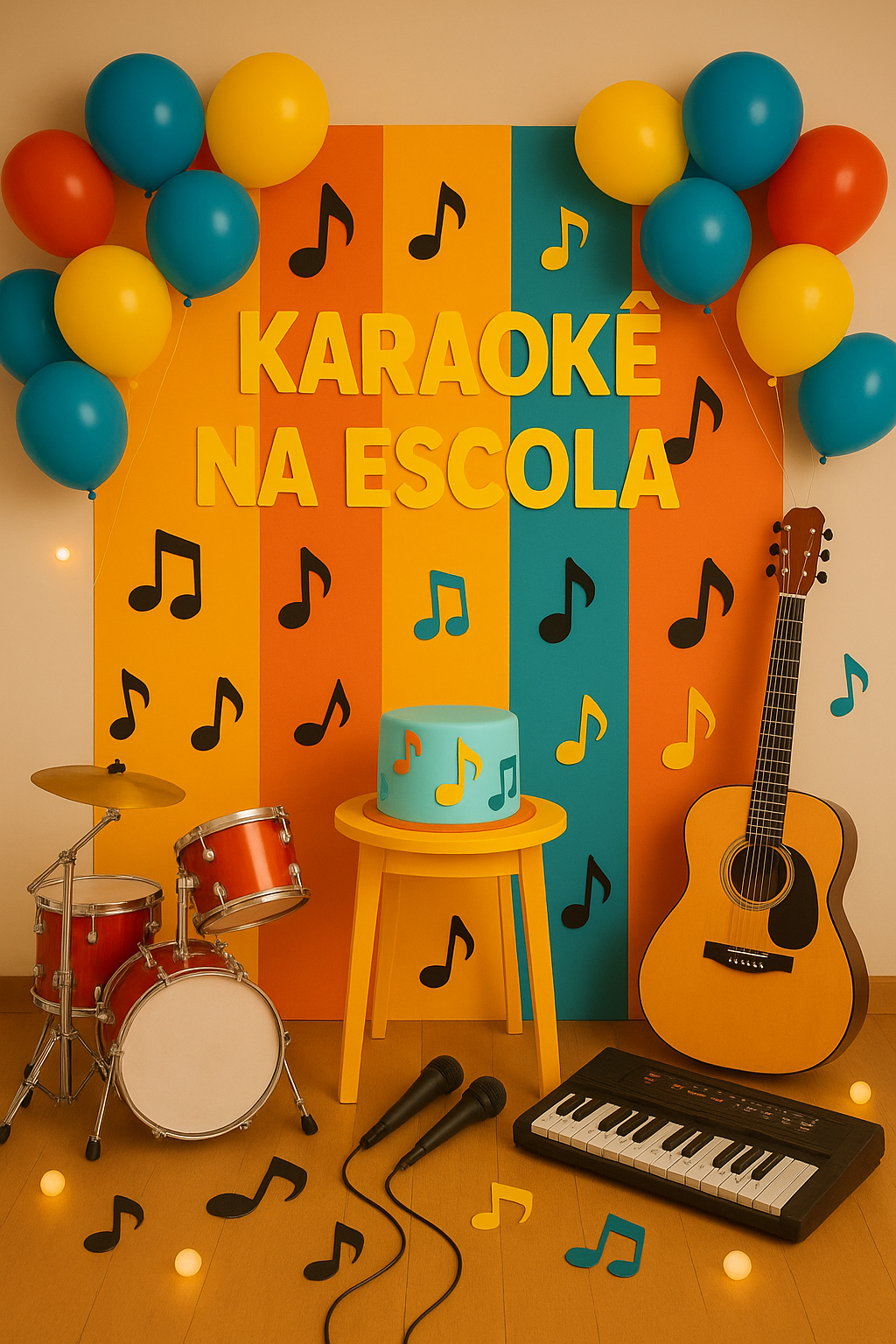 🎨 Acompanha: elementos extras como notas musicais, microfone 3D e coroa decorativa para compor o cenário.