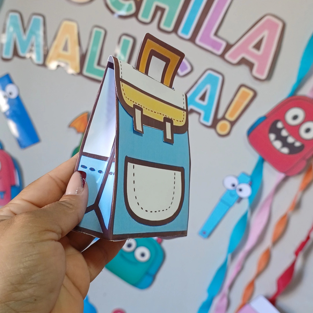 ✔️ Caixinha de Lembrancinha – personalizada no tema da Mochila Maluca, ideal para colocar doces, brinquedinhos ou mensagens especiais para as crianças.