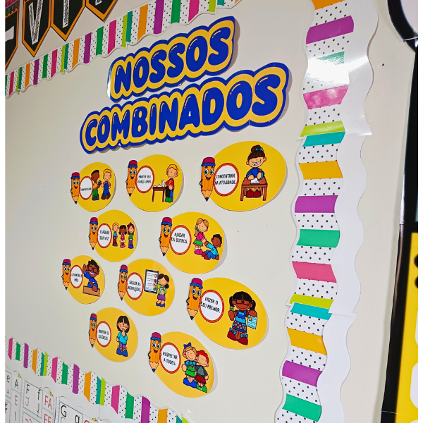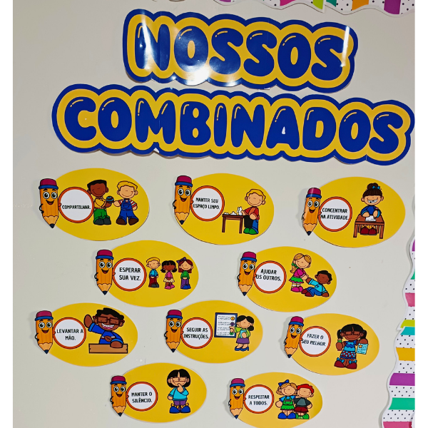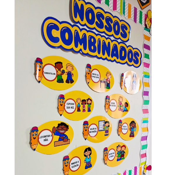 O Painel Nossos Combinados do Lápis foi criado para ajudar as crianças a compreenderem e praticarem regras de convivência de forma leve, clara e acolhedora. Ideal para reforçar valores, disciplina e respeito no dia a dia escolar, com um visual lúdico que combina perfeitamente com a sala de aula 📚✨